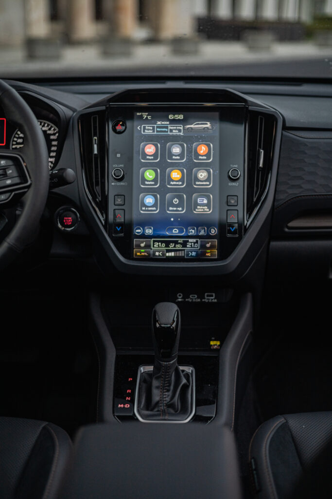 Pomocny okazuje się również fakt, że Forester 6. generacji już w standardzie wyposażony jest w dotykowy ekran o przekątnej 11,6 cala. System obsługuje bezprzewodowo interfejsy Apple CarPlay i Android Auto, które pozwolą na strumieniowanie ulubionej muzyki bezpośrednio ze smartfona (ten leży bezpiecznie na półce z ładowarką indukcyjną) oraz uruchomienie nawigacji. Dzięki temu łatwiej jest poruszać się po mieście i na bieżąco śledzić informacje o ewentualnych zatorach na ulicach.